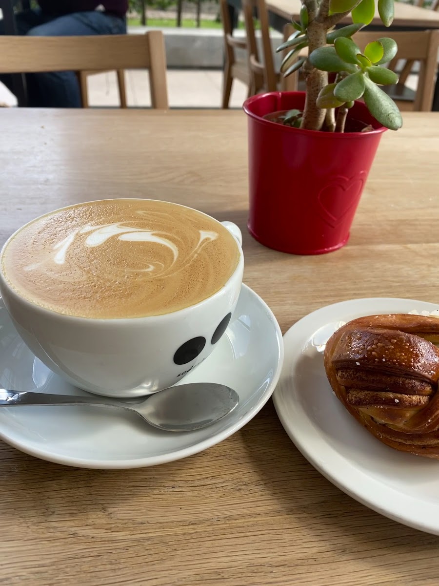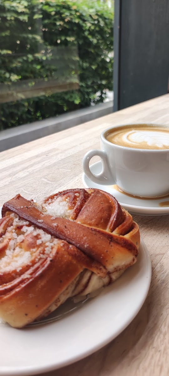 It's a nice place to get a coffee and a snack. If you go early, you have a better choice of pastries and buns. The cardomen buns are delicious and highly recommended. Coffee was OK - but cold because they took forever to make it. The most laughable thing is the rest room where you need a code to enter - and it's on he receipt. I guess that's reasonable due to probable past abuse by non customers. The tables were sticky and not very clean. Shame.